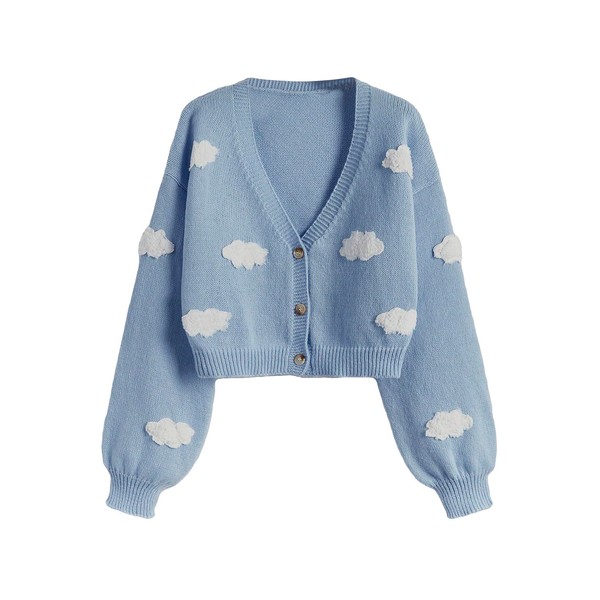 SHENHE Women's Cloud Print Button Down Sweaters V Neck Long Sleeve Crop Cardigan Top Light Blue Large