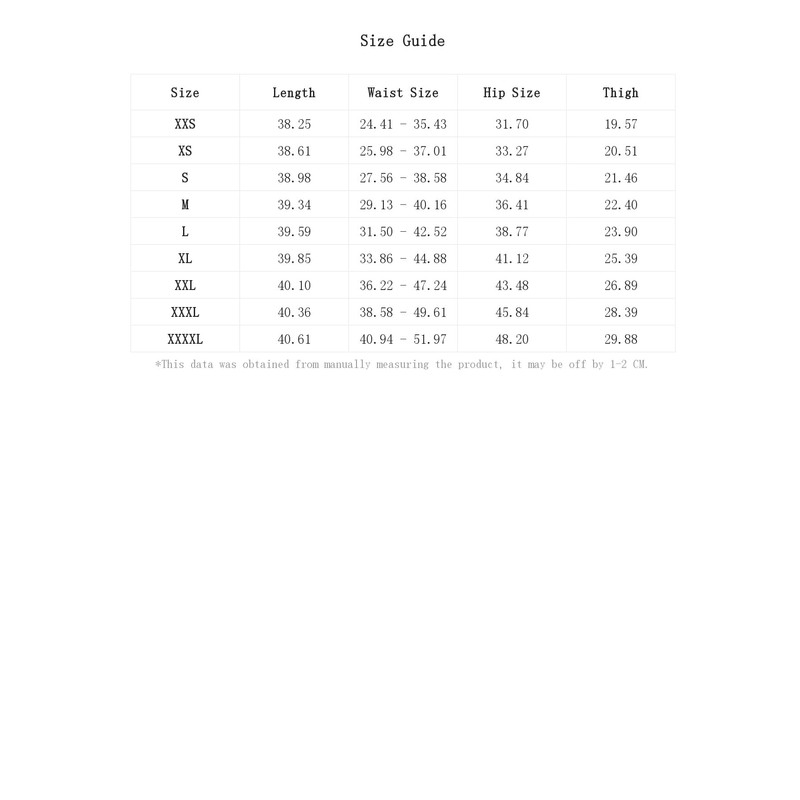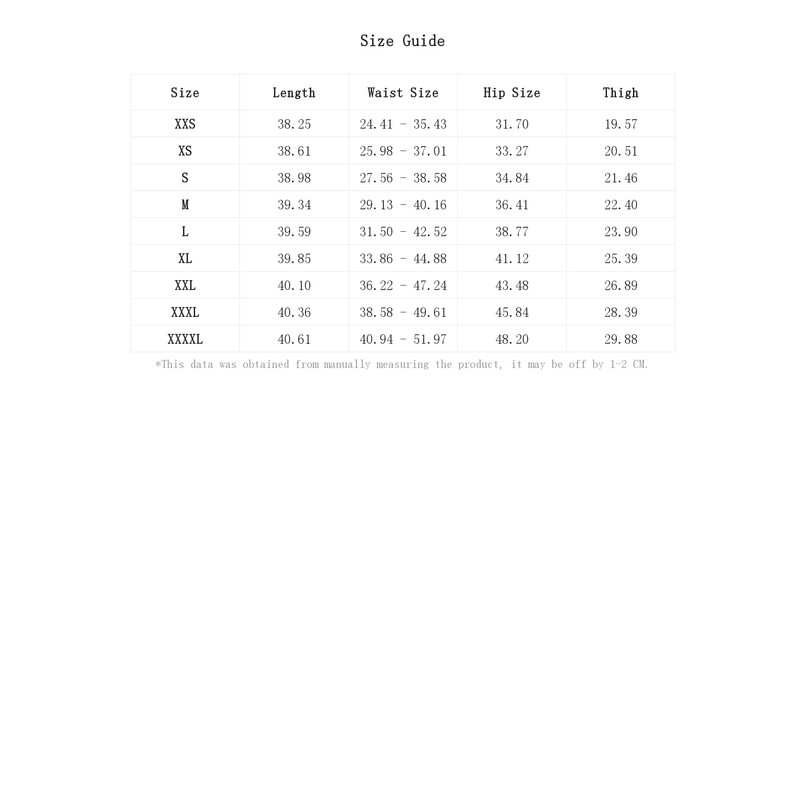XS:Hip Size:33.3IN,Length:38.6IN,Thigh:20.5IN,Waist Size:26.0-37.0IN