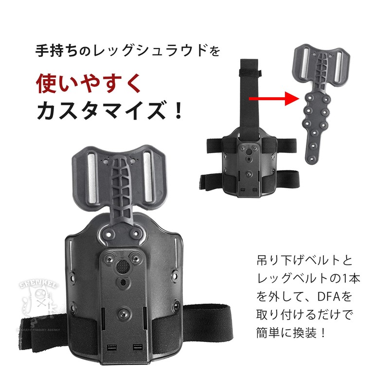 - Contents: DFA unit, T spacer, 3 screws. *If you attach it to a leg holster (double strap leg shroud) with 2 straps such as 6004/6005, please remove the upper strap and use it as a single strap