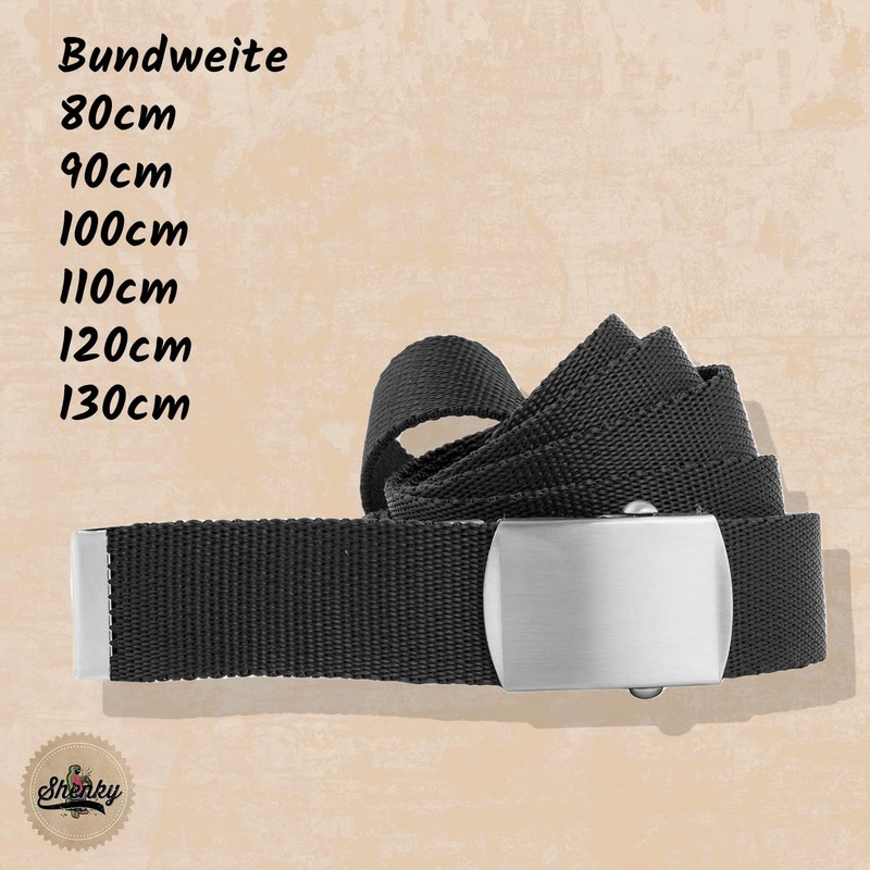 Very high quality Shenky belt Extra strong buckle for best quality. The width of 3 cm is ideal for jeans and other trousers. The sizes given are total lengths. The belts can be shortened as desired as the buckle is removable. The belt can also be used for outdoor activities or even in the military. The strap is extremely robust and the buckle is very elegant. Available sizes: 80 cm, 90 cm, 100 cm, 110 cm, 120 cm, 130 cm