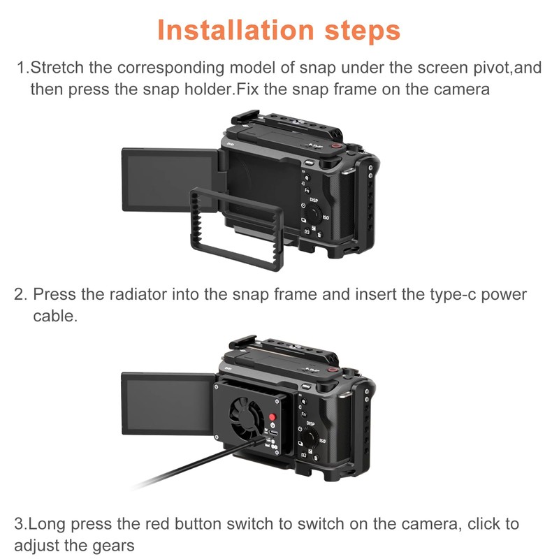 - Extremely quiet: heat dissipation is carried out via a whisper-quiet cooling fan that works silently, so you can record videos without interference from fan noise. Equipped with advanced semiconductor cooling technology, the camera cooler effectively dissipates heat and keeps your camera at an optimal temperature, ensuring smooth and uninterrupted recordings.