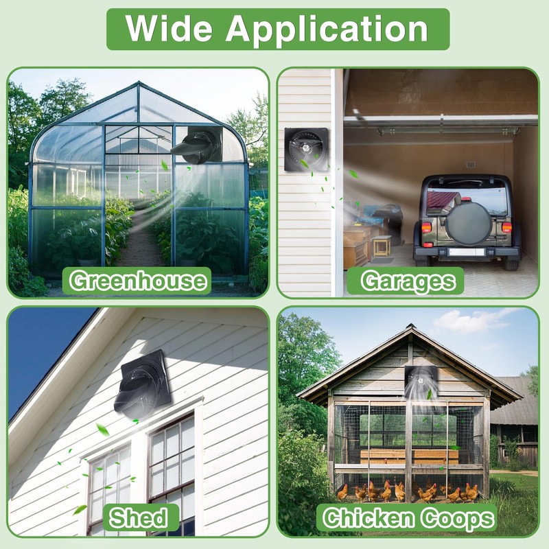 - 【Effective Air Circulation】This solar exhaust fan kit promotes air circulation to effectively remove excess heat, moisture, dust and odors from indoor spaces, keeping the air fresh. Suitable for small space ventilation, ideal solar fan for small greenhouse, chicken coop, shed, pet house, garages, small gardens, attics, barns, basements, RV, outdoor camping, window exhaust.