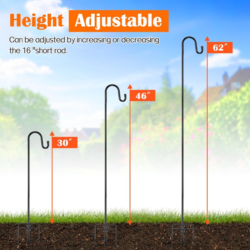 - Height Adjustable: Our shepherd hook is adjustable in height, allowing you to choose the height according to your needs by adding or subtracting a 16 inch short pole, providing versatility for hanging bird feeders, lanterns, flower baskets, and more, meeting your various needs.