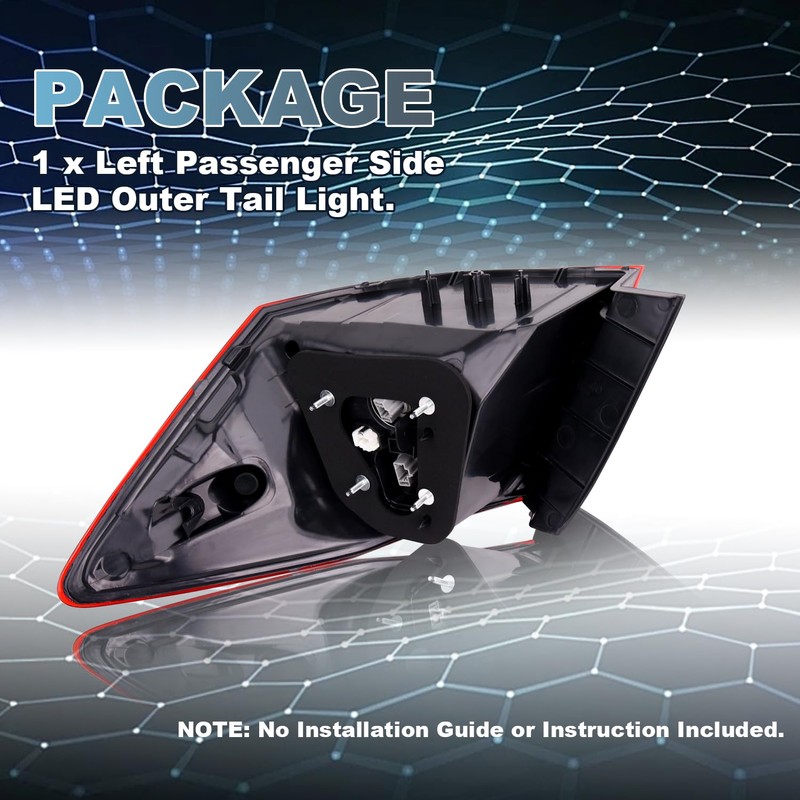 - INSTALLATION & PACKAGE: No installation guide or instructions are provided. It is recommended that professional installation is preferred. The package includes 1 x Left Driver Side Outer Tail Light.