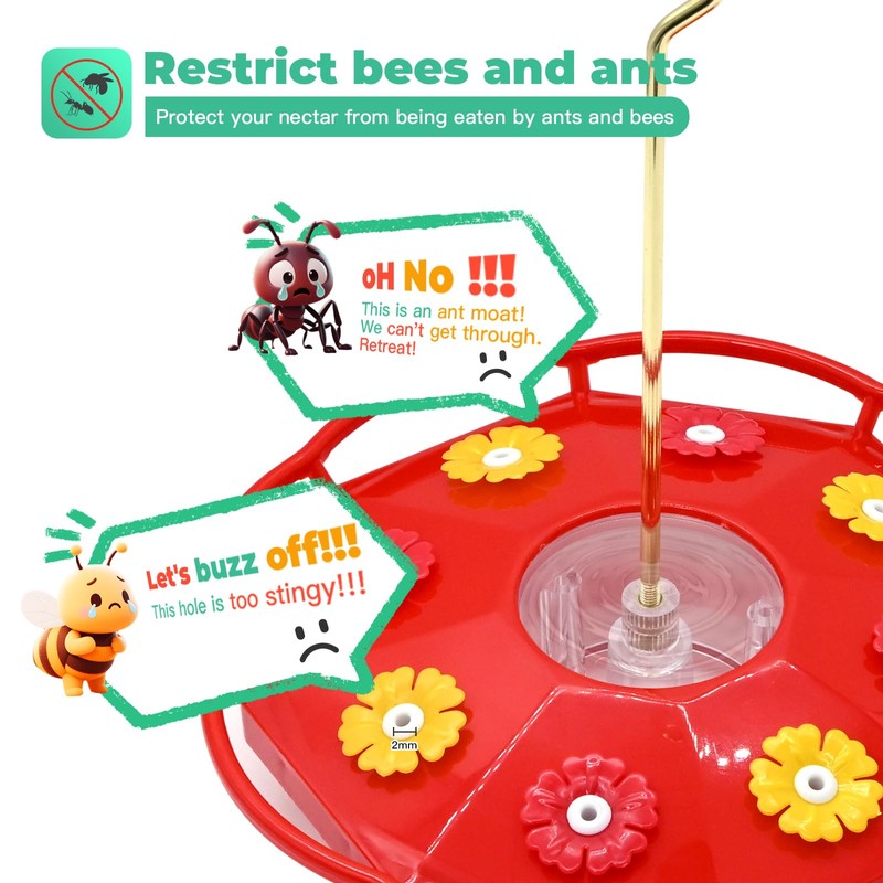 - Sturdy & Durable Design This hummingbird feeder is made of sturdy plastic and will not break easily, even if it falls. It features an anti-ant moat and 8 bee-proof feeding ports. The feeder includes 4 replaceable white petals for customizable styling.