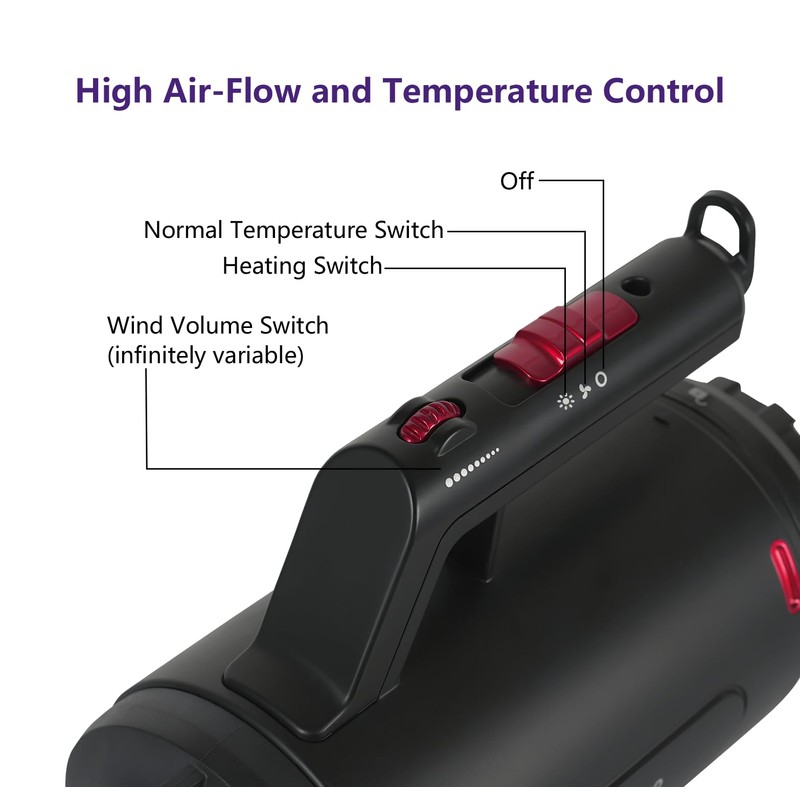 - TEMPERATURE 2 temperature settings, the unique temperature settings form 55F12.8) to 118F48). The stable air flow will help dry faster with less damage. ADJUSTABLE SPEED The adjustable speed dial from 515FPM-44000FPM makes it great for controlling noise levels especially when grooming sensitive dogs.