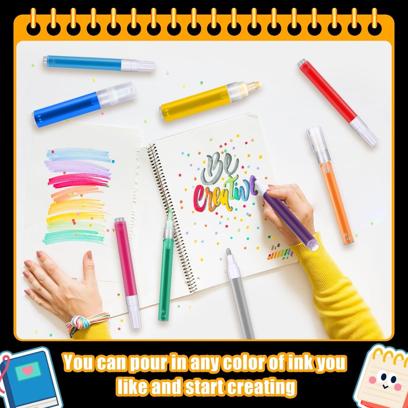 • Kind Reminder: if you want to add whiteboard water or ink to the refillable markers, please press the tip lightly, otherwise the ink will be ejected from the pen tube without backflow due to the valve; When you want to add acrylic ink, paint ink and powder type ink, these powder particles need to reach nanometer standard, because our pen tip hole needs powder particles of more than 800 mesh to write, otherwise the ink will flow out from both sides of the pen tip
