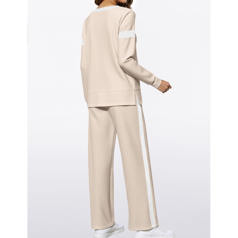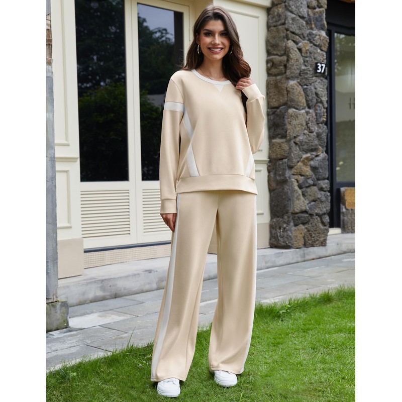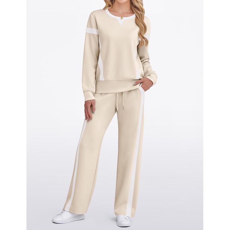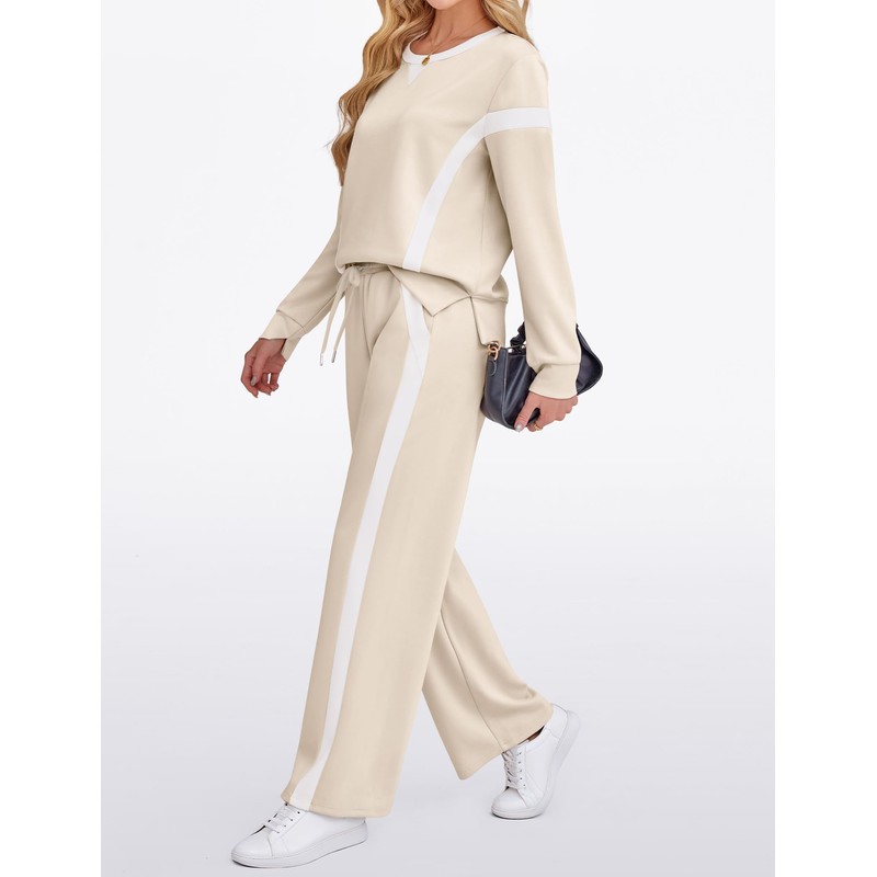 - DESIGN:Women's tracksuit features color block design, creating an elongated silhouette. crewneck/ longsleeve/ side slit tops.wide-leg sweatpant with pockets, loose fit to suit petite and tall body types.This track suit set balances comfort, style, and functionality.