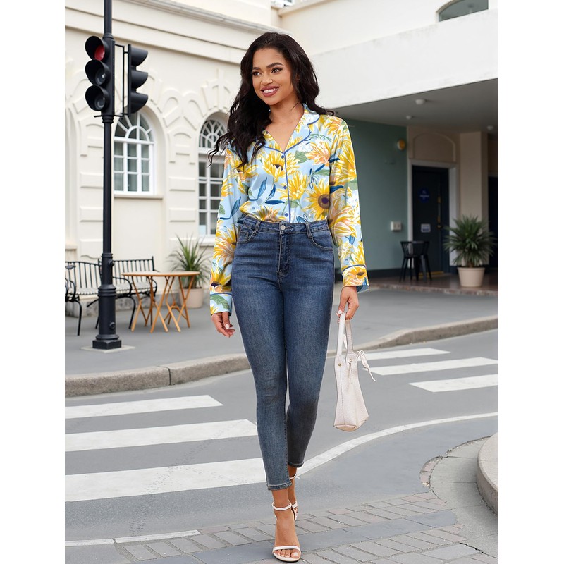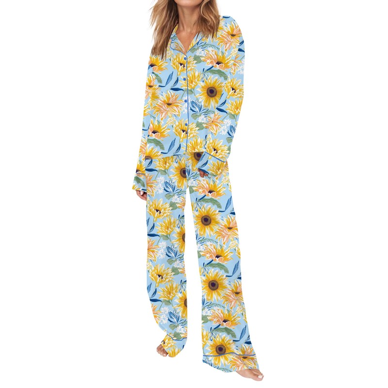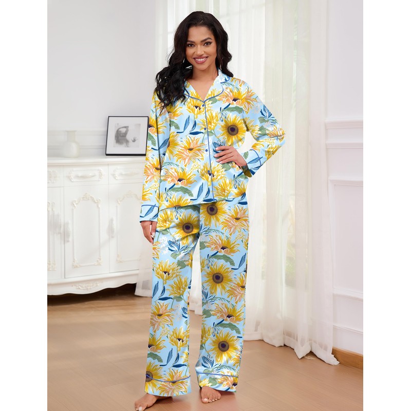 SHESHOW Silk Pajamas for Women Set Button Up 2 Piece Pjs Long Sleepwear Sunflower Pjs for Women Set Size XL
