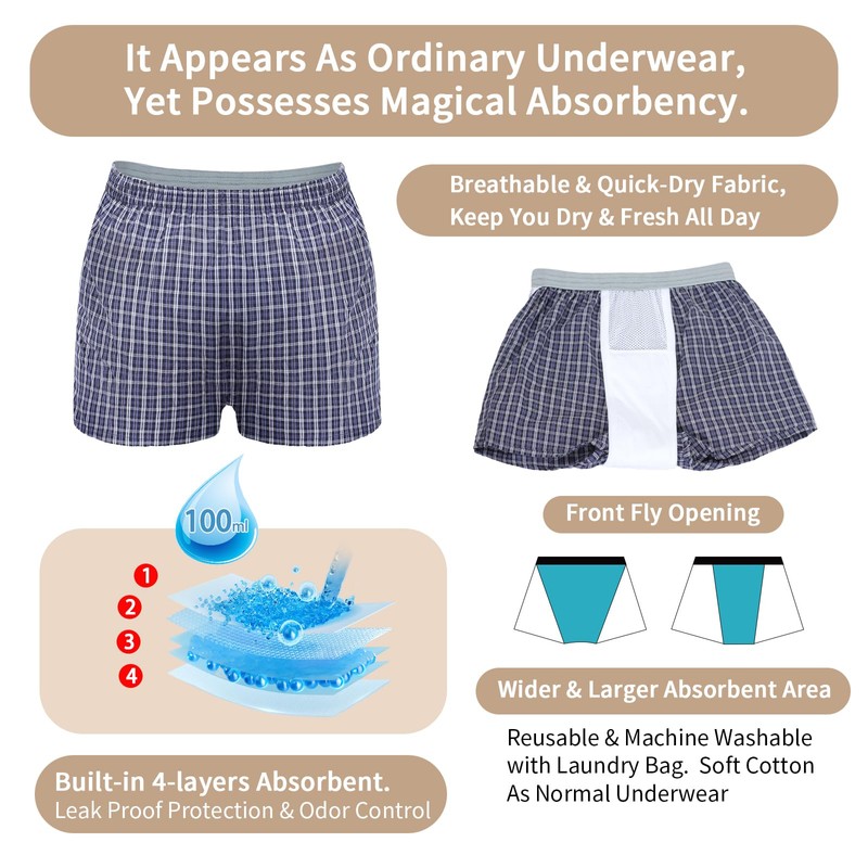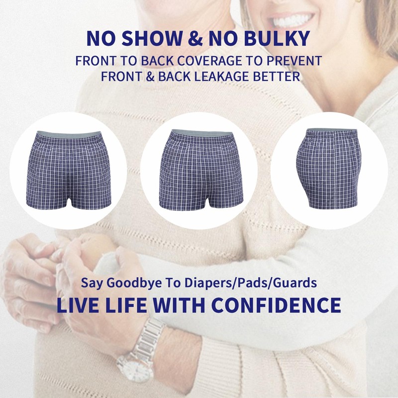 - Efficient Absorption Layer - The men's incontinence underwear comes with a state-of-the-art four-layer hanging absorption structure, offering a comprehensive shield from front to back. Crafted with a comfortable loose elastic band to minimize abdominal tightness, they maintain the appearance of regular boxer briefs while providing leakproof assurance for your peace of mind. You can even wear the plaid boxers freely lounging at home.