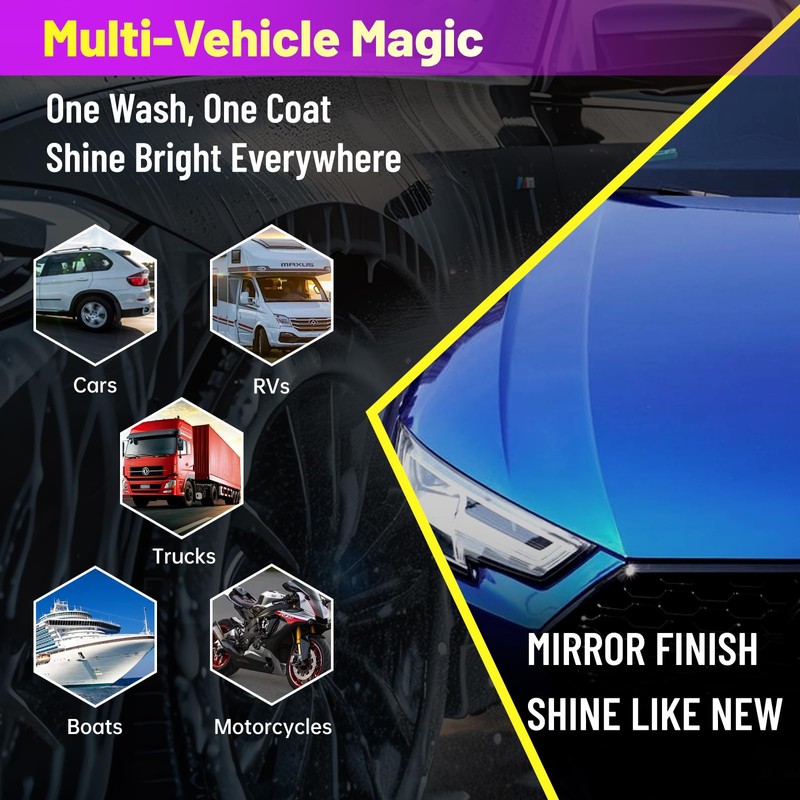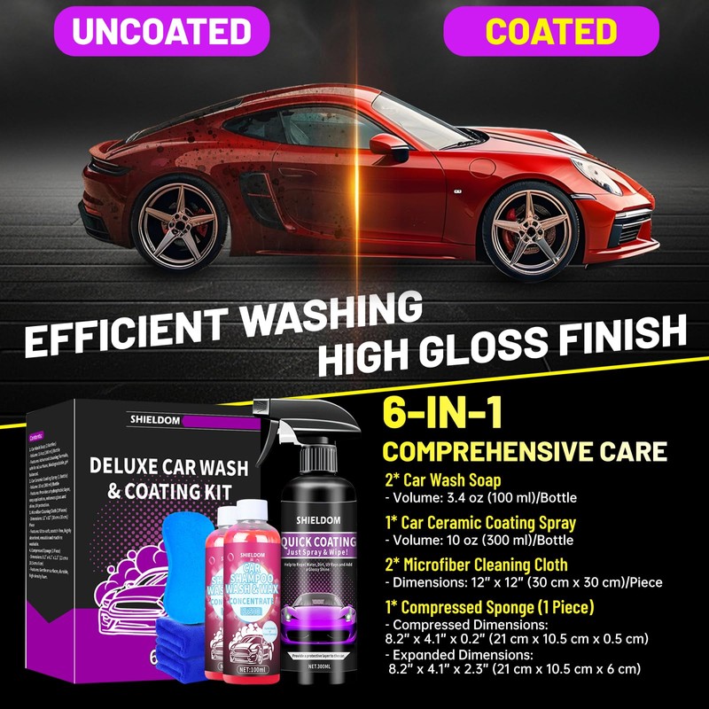 - Comprehensive Car Care Kit: This kit includes a car ceramic coating spray, 2 car wash soap, 2 microfiber cleaning cloths, and a compressed sponge for enhanced shine and protection.