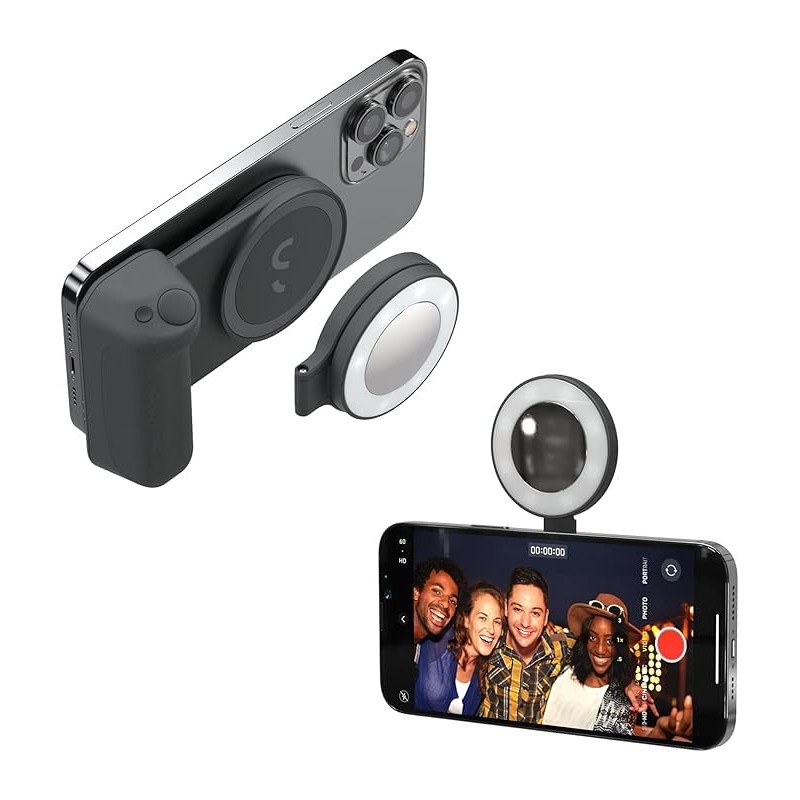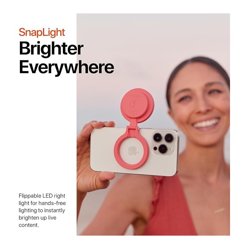 ShiftCam SnapLight - the ultimate hands-free LED selfie ring light for anyone who loves taking pictures, videos or live streaming on their phone. With its flippable design and four adjustable brightness settings, the SnapLight is the perfect accessory for illuminating your subjects in any environment. The SnapLight features a built-in battery that lasts up to 2 hours, so you can snap as many photos as you want without worrying about running out of power. Additionally, the center of the LED ring light includes a convenient mirror for any last-minute checks before you go live. The SnapLight's magnetic mount is designed to snap onto any phone and is compatible with both iPhone and Android devices. It also works with SnapGrip accessories and is MagSafe compatible, making it easy to attach and detach whenever you need to. But the SnapLight doesn't just work on its own - it's part of the larger SnapGrip ecosystem. You can use it together with SnapGrip and SnapPod accessories in any combination, allowing you to create the perfect setup for your unique needs. Whether you're a social media influencer, a professional photographer or just someone who loves taking selfies, the ShiftCam SnapLight is the perfect accessory to help you look your best in any lighting conditions.