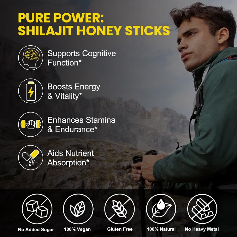 - Shilajit Honey Sticks: Crafted from the highest quality gold-grade Himalayan shilajit, which sourced at altitudes of 18,000 feet ensuring the extract is pure and potent. Combos with organic honey,provide you a 100% natural and completely vegan, non-GMO supplement