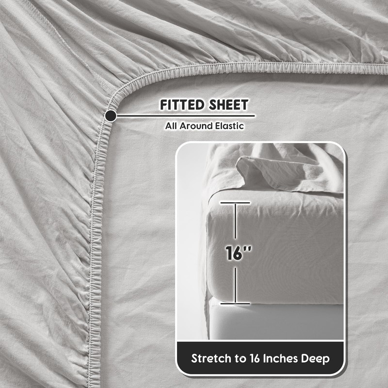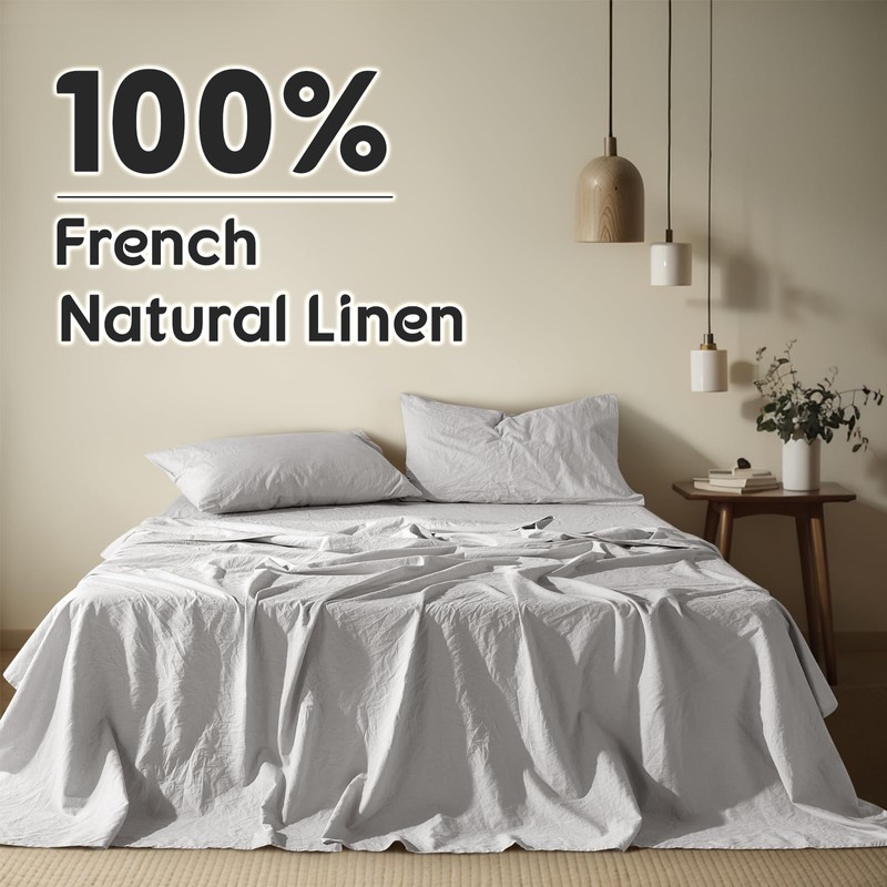Shilucheng 100% French Linen Sheets - King Size Bed Sheets, Breathable & Cooling Pure Linen Sheets,Soft Durable and Tear Resistant -16 Inch Deep Pocket - 4Pcs (Grey, King)