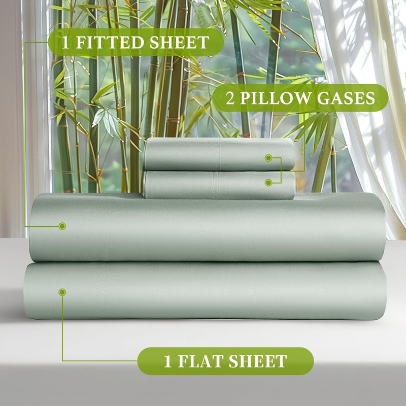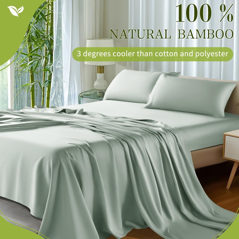 Shilucheng 100% Viscose Derived from Bamboo_ Sheets Queen Size 4pcs - Ultra Cooling & Silky Soft Bed Sheets, 16" Deep Pocket, Perfect for Hot Sleepers, Hotel Bedding Sheets (Sea Glass)