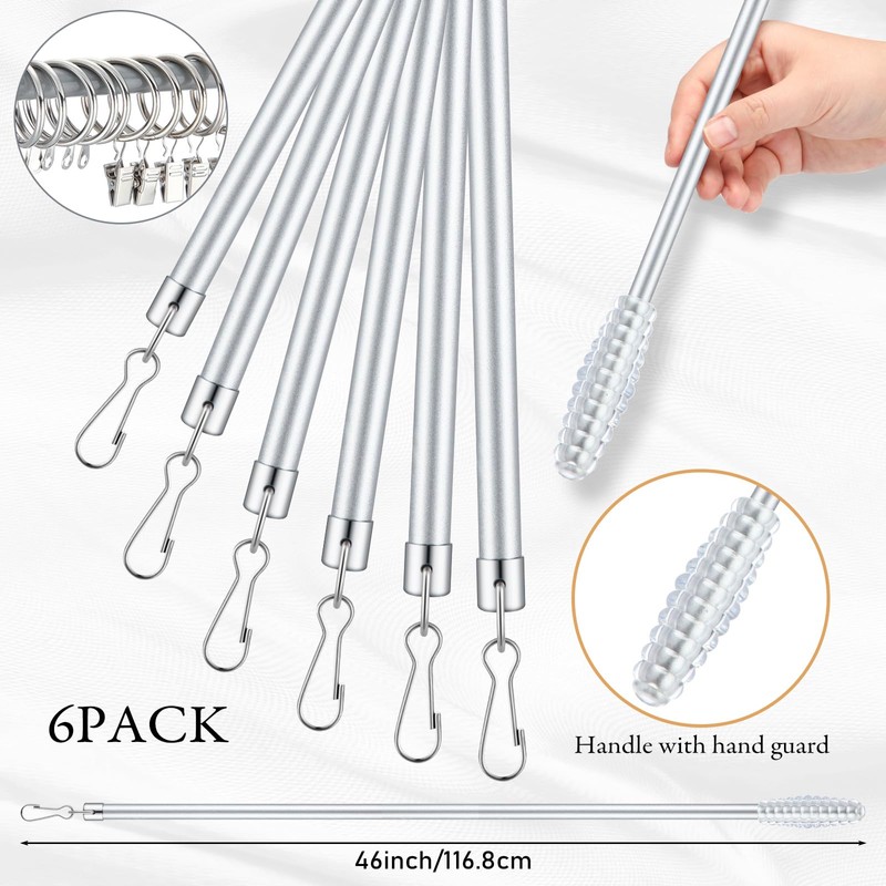 Shimeyao 6 Pack Stainless Steel Iron Curtain Pull Wand Universal Drapery Pull Rod Invisible Metal Drapery Wand with 5 Hooks and 5 Rings for Grommet Curtains Opening(Silver,46 Inch)
