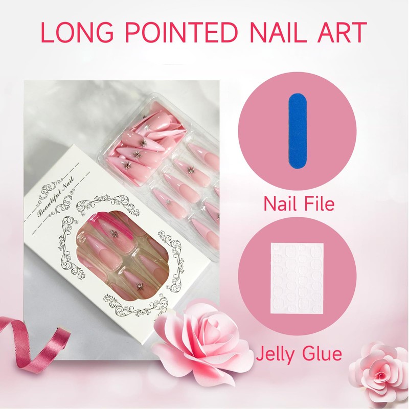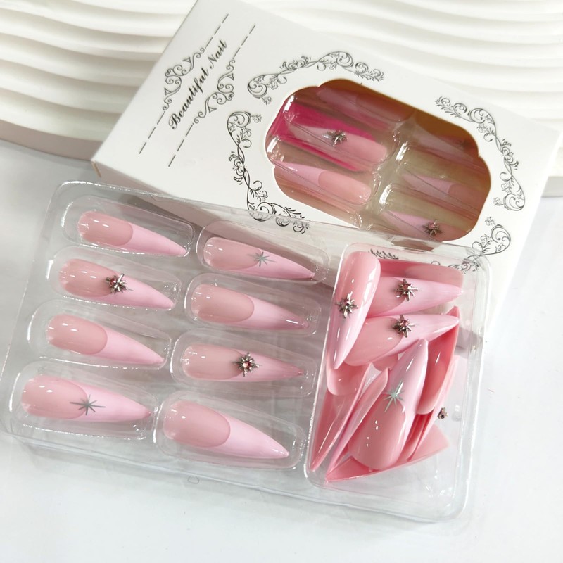 Shimmerz 24 Pieces Long Stiletto Sticker Nails French Tip Pink Star Design False Nails Full Cover