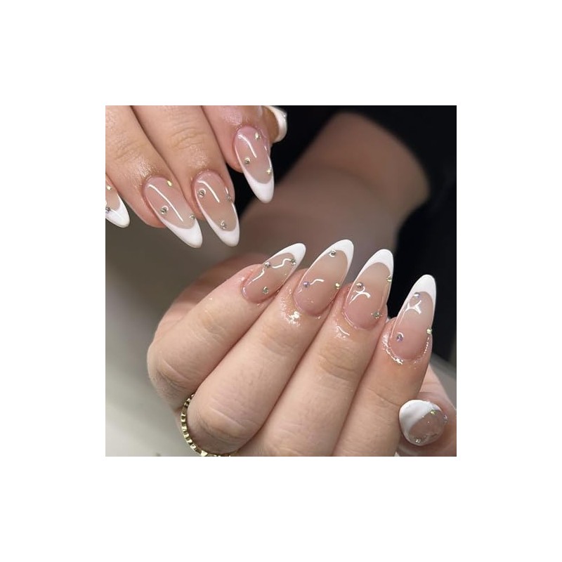 Shimmerz 24 Stück Weiße Französische Spitze Aufkleber Nägel Falsche Nägel Handgemacht Funkelnder Diamant Design Französische Nägel Aufkleber Strass Nägel