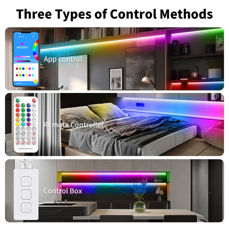 - 【Three Control Ways】Our bluetooth smart controller has three control ways to control your RGB-IC led neon strip light, such as: bluetooth App, IR remote and control box. The bluetooth app compatible with IOS and Android systems.