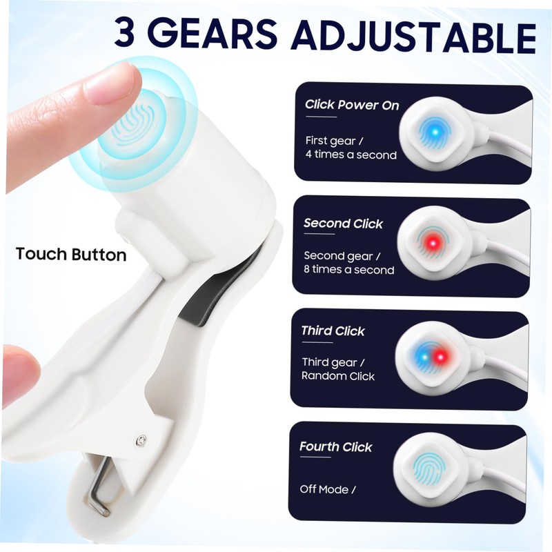 -Note: 3 different speeds, 4 per second(blue light), 8 per second(red light), click randomly( lights flash alternately) automatic phone clicker.