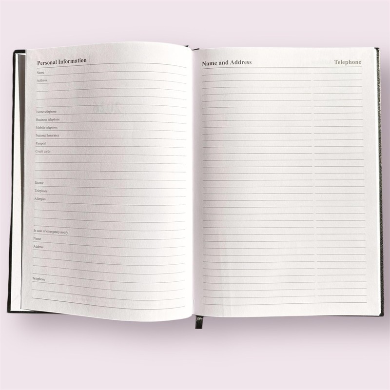 - Deluxe hard backed cover with co-ordinated ribbon page marker.Silve Foil text on cover. Hardcover with matching ribbon bookmark