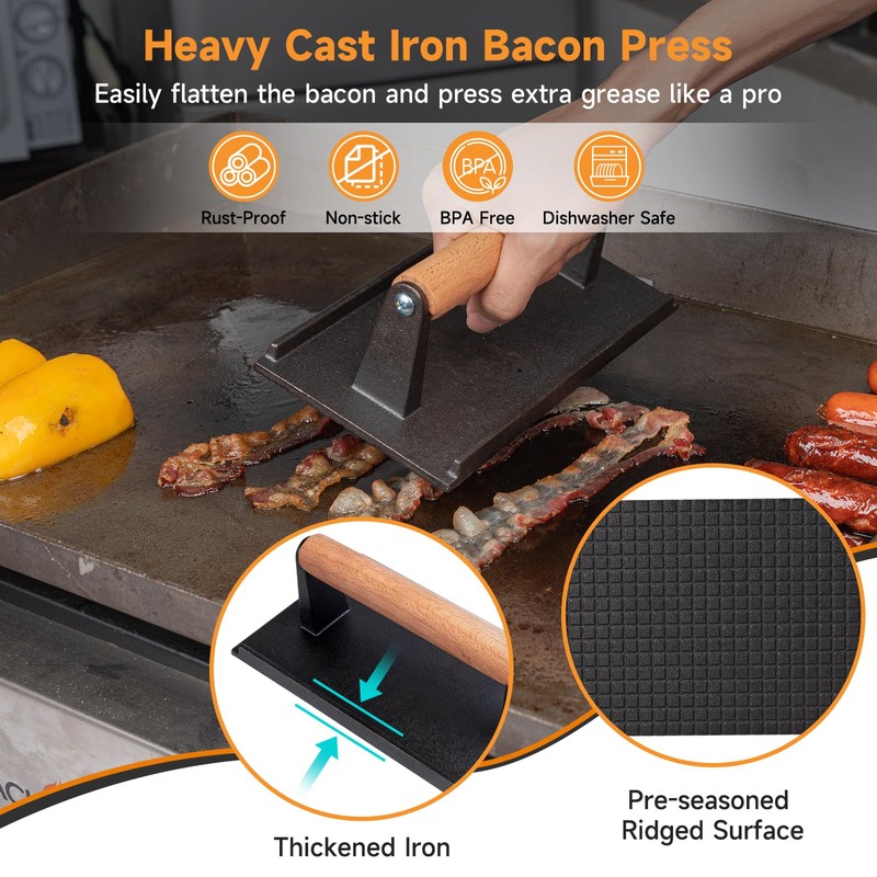 - 【Heavy Duty Bacon Press】 The rust-proof pre-seasoned cast iron press enhances the culinary effect and easily smashes the patty down to a flat patty shape like a pro