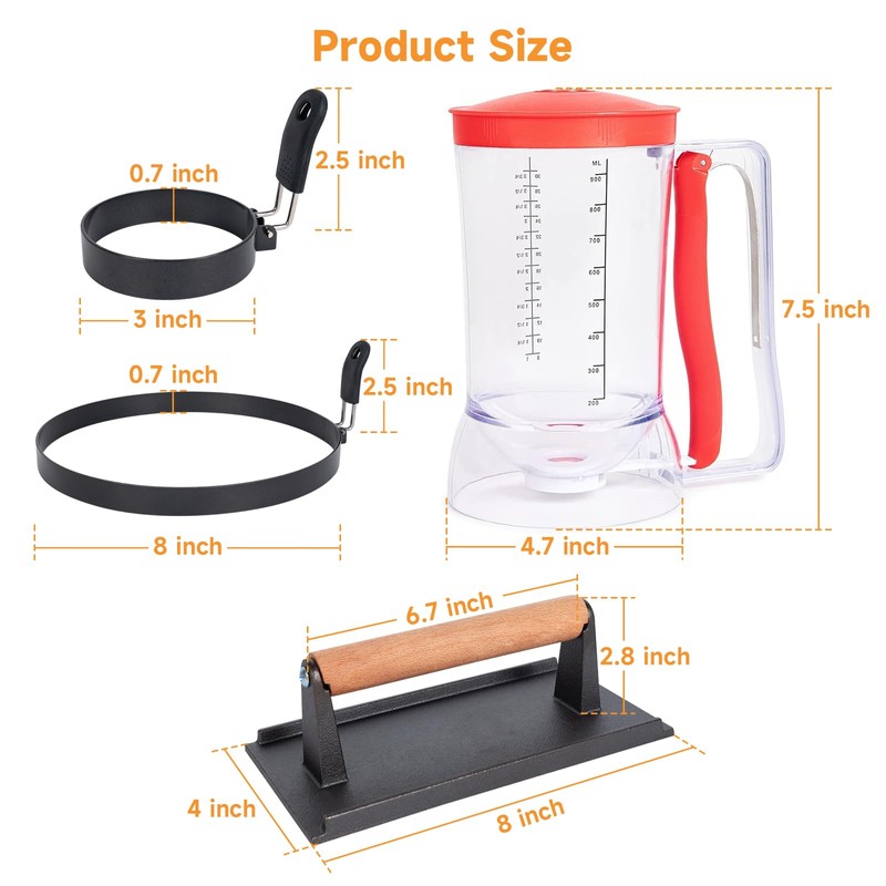 - 【Large 8" Pancake Ring】 Under the pancake dispenser we provide, an additional bonus with this 8-inch pancake ring to cook restaurant-style pancakes or omelets, customized with your favorite ingredients