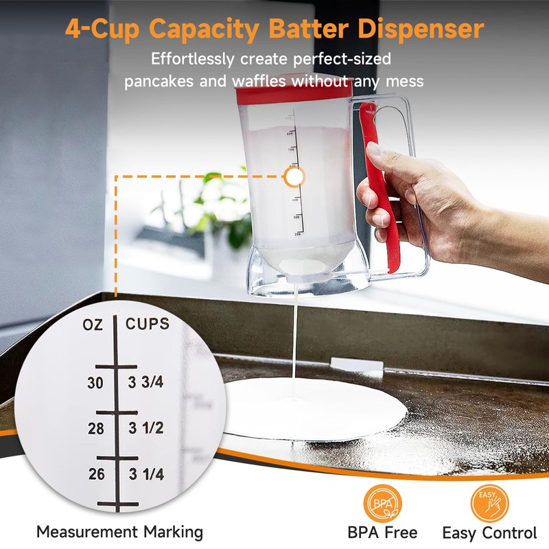 - 【Precision Pancake Dispenser】 Holds 4 cups of batter and features a measurement display for perfect dispersion of evenly sized pancakes, waffles, and muffins