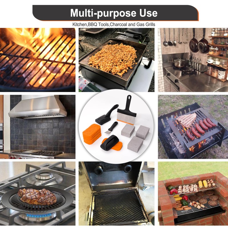 - Efficient Tools Set: This set includes 1 cleaning pad handle, 1 cleaning brick handle, 1 scraper, 1 small scraper, 3 cleaning bricks, and 5 scouring pads. No matter if you just need a simple wipe-down after griddling, tackle tough residue, or restore your griddle's surface, this kit covers all your needs.