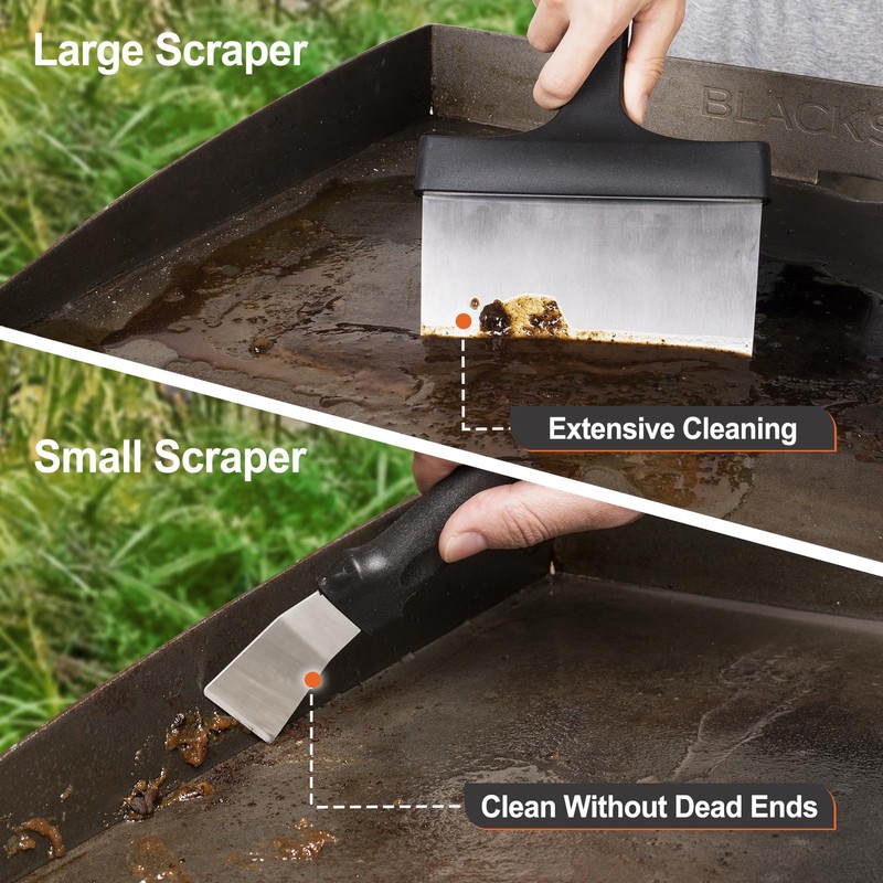 - Stainless Steel Scraper: Featuring a robust flat top grill scraper to effortlessly remove baked-on residue and a smaller scraper for those tricky edges and tight spots, this set ensures your griddle shines like never before.