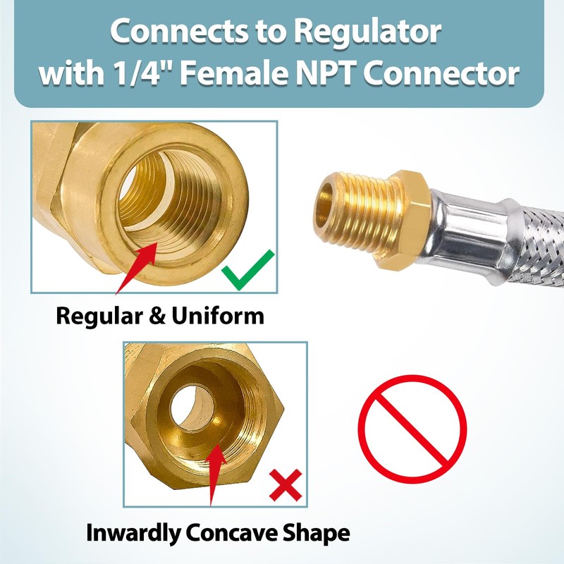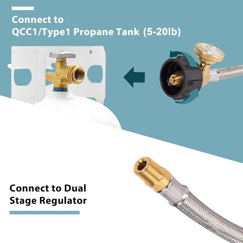 - Debe tener si eres un RVer. La manguera de suministro de 12" te permite conectar un tanque de propano recargable de 5-40 libras al regulador estándar NPT de dos etapas de tu caravana.