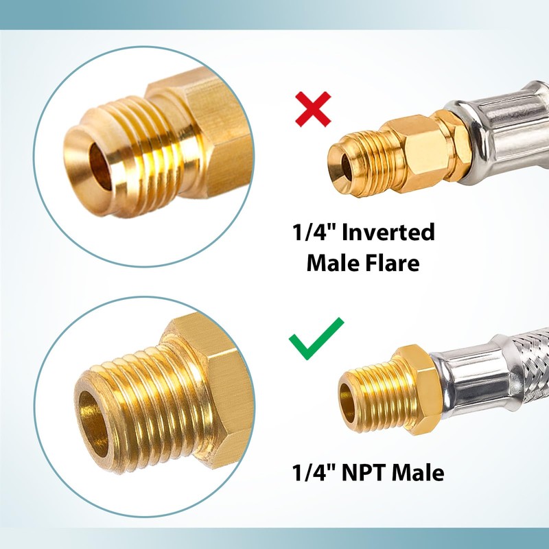 - NPT macho de 1/4" (no destello invertido de 1/4"). No es compatible con regulador de cambio automático de 2 etapas con accesorios de destello invertidos hembra de 1/4".