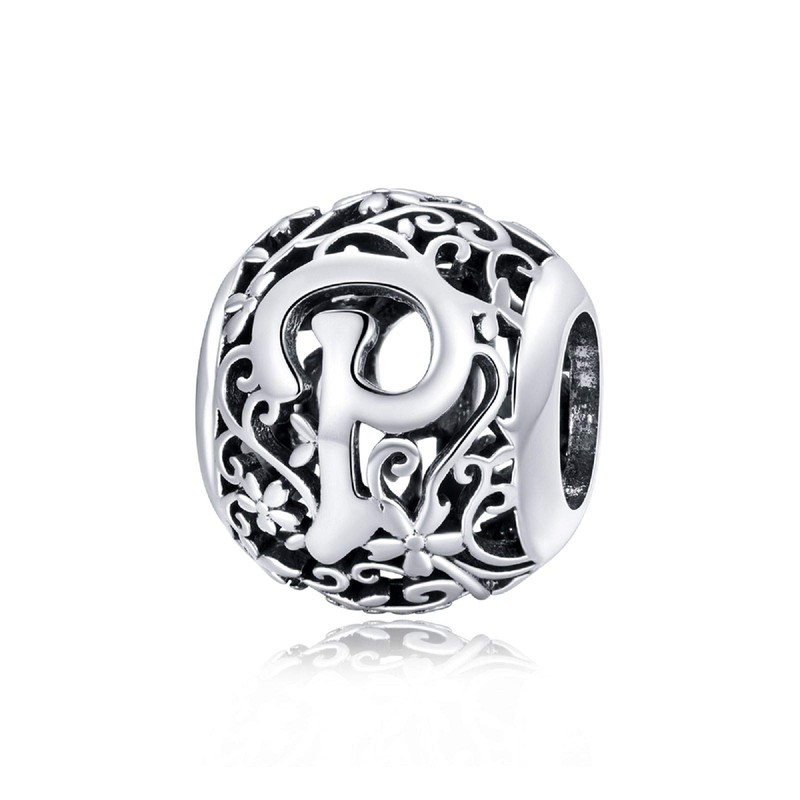 Shining Charm Letter Initial P Alphabet Beads Round Flower 925 Sterling Silver Charms for Bracelets