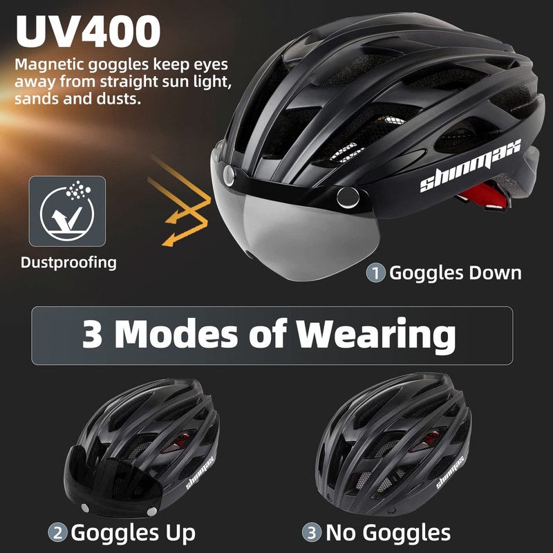- Visor and LED rear light: Unique bicycle helmet with visor magnetic design perfectly blocks the sun and dust from the face. The removable visor can be easily attached to the bicycle helmet and removed. This bicycle helmet with light warns other riders behind you clearly notice your direction, improves driving safety at night