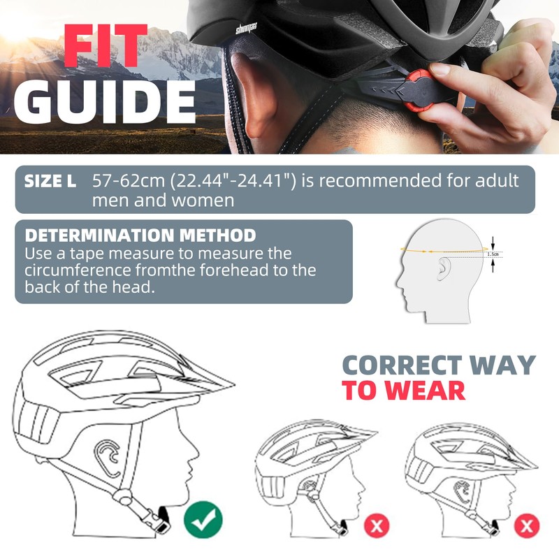 - Adjustable sizes: the road bike helmet comes with a standard size. The adjustment belt works perfectly and is well made. MTB helmet with chin pad, one-touch buckle adjustment system, side straps will increase / decrease the size to your liking, 57-62 cm (22.44 - 24.41 inches). This bicycle helmet is suitable for men and women