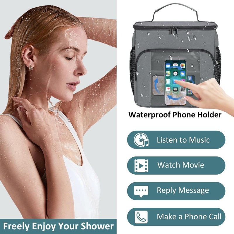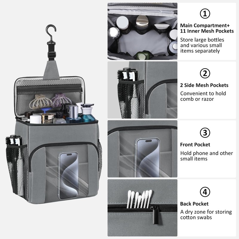 - 【Transparent Phone Holder】The toiletry organizer can not only store toiletries but also be a secure phone holder. You can place your phone in the front pocket horizontally or vertically, its transparent design enables you to watch a movie or send a message when bathing. The pocket can protect your phone from water splashes without reducing touch sensitivity.