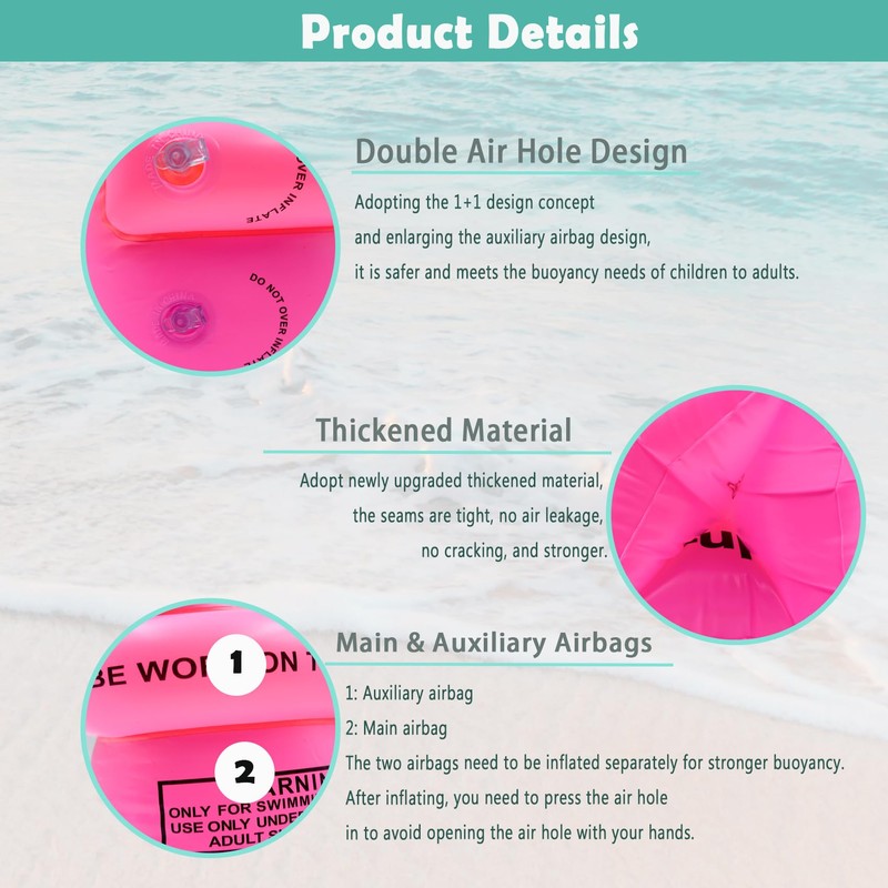 - Durable and Safe: Made from high-quality, inflatable thick PVC and rubber materials, our arm floaties are built to last and provide reliable buoyancy. The dual air holes and main/secondary airbag design provide ample buoyancy, making swimming safer for beginners.