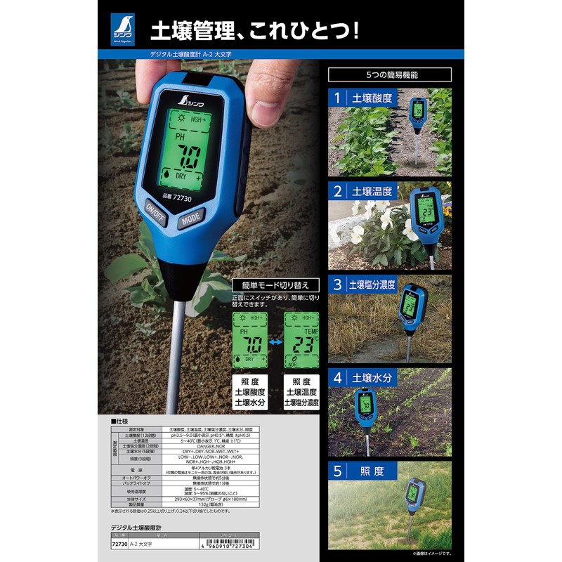 - 12 soil acidity levels: pH 3.5 - 9.0 (minimum display pH 0.5, accuracy ± pH 0.5)