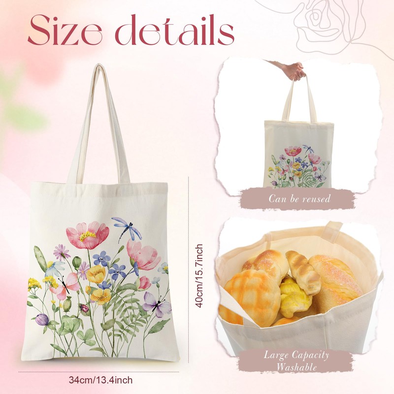 - 12 Diverse Designs: 12 tote bags showcase different bouquet designs with vivid colors, look classic and attractive, covering a variety of flower varieties; These tote bags come in a range of colors and designs, including popular wildflower patterns, making it easy to pair with different outfits and styles; It also makes a good gift for any occasion
