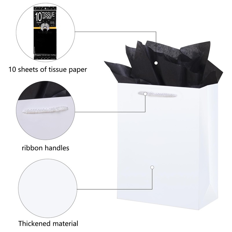 - Each gift bag comes with white braided handles and black decorative tissue paper.