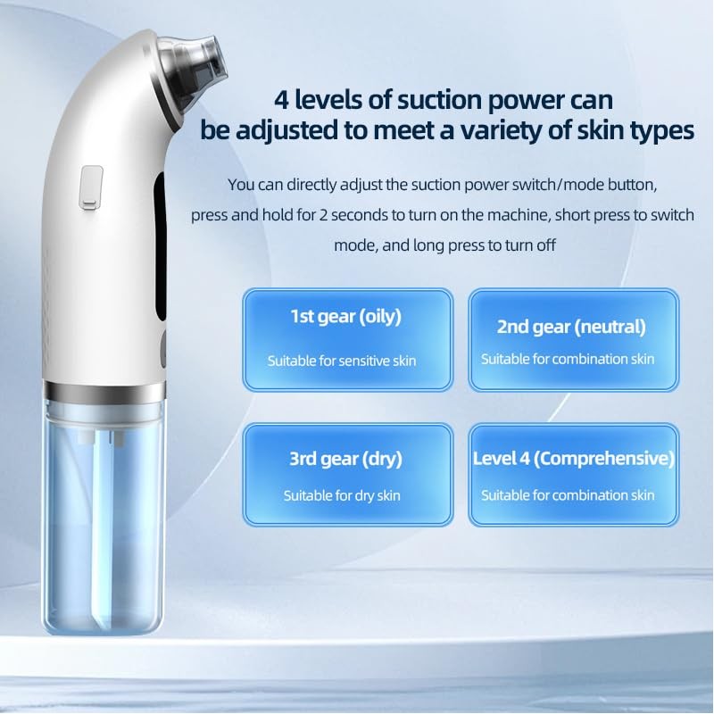 - 【3 Einstellbare Saugstufen】- Es verfügt über 3 einstellbare Saugmodi, egal ob Sie empfindliche oder fettige Haut haben, es gibt immer einen, der für Sie geeignet ist. Der erste Gang (oilness) ist für empfindliche Haut geeignet, der zweite Gang (neutral) ist für Mischhaut geeignet, der dritte Gang (dryness) ist für trockene Haut geeignet und der vierte Gang (snthesis) ist für Mischhaut geeignet. Sie Sie können die Saugstärke individuell an Ihren Hauttyp und Ihre Bedürfnisse anpassen.
