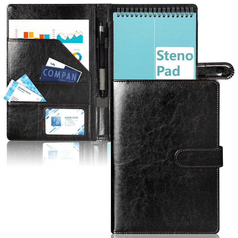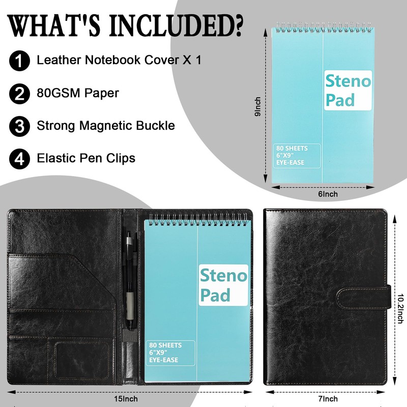 - Package sent to you: You will get a black steno pad holder with spiral steno pads. The size of the cover is 7*10.2*0.6 inches, while the size of the inner page is 6*9 inches.You can get a high-quality cover and an inner page for writing at one time.