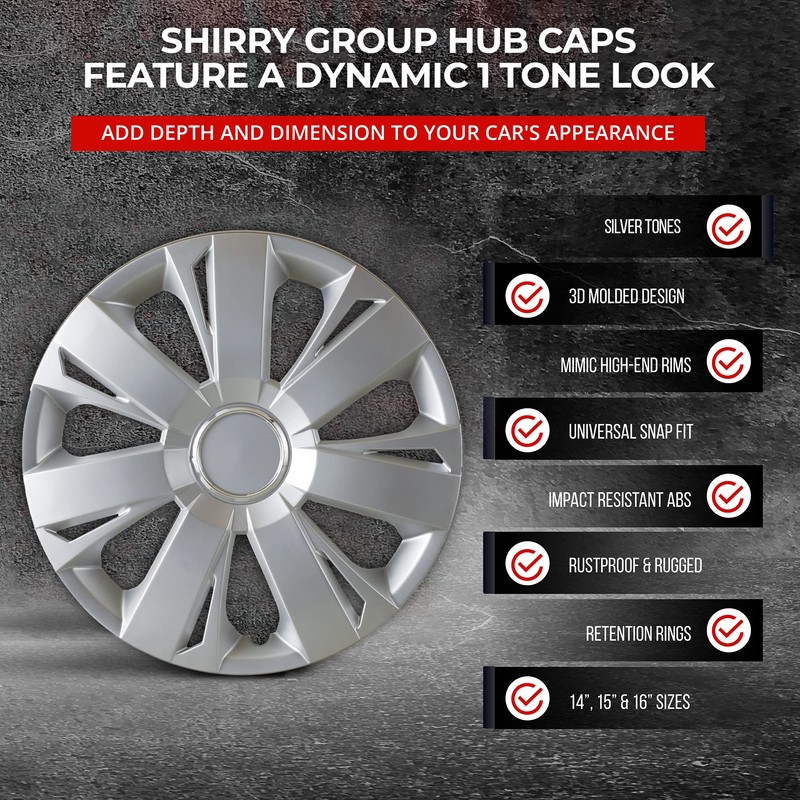 - ESSENTIAL CAR-ACCESSORIES for your family car or ride-share sedan, Shirry Group Hub Caps elevate any vehicle. Give a set to your teen for their first car or give a used car more curb appeal for resale.