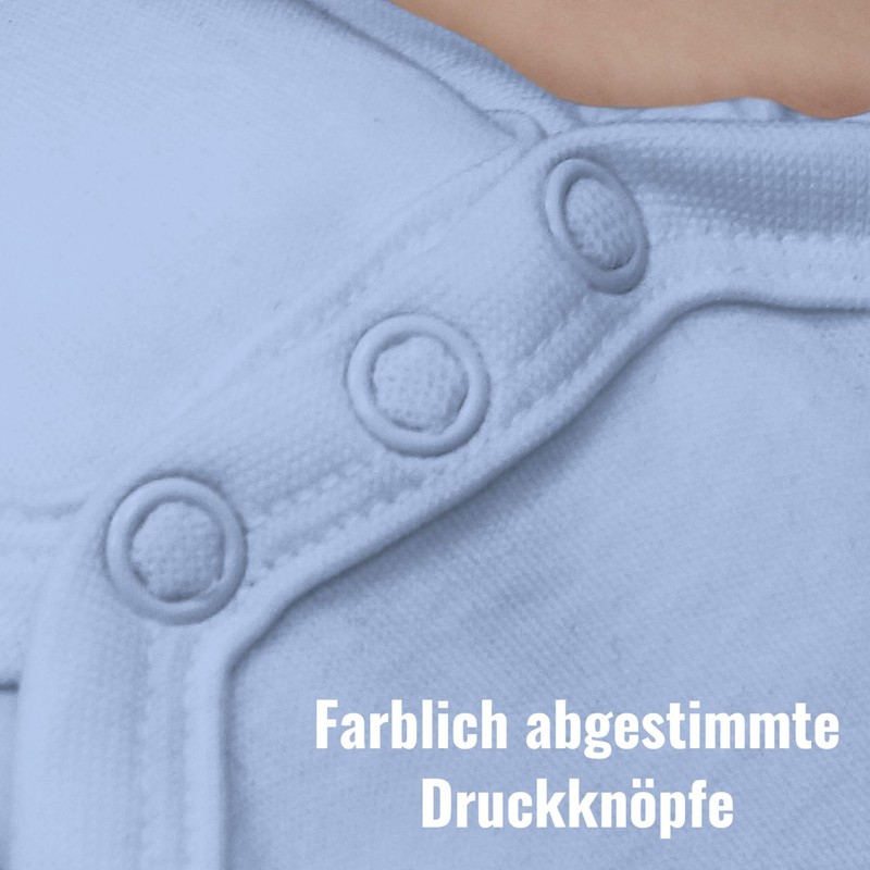 The baby bodysuit is made from 100% cotton. Thanks to an envelope neckline, narrow edged neck and armholes and the soft, elastic fabric, the baby bodysuit is particularly comfortable and allows maximum freedom of movement. The tone-on-tone press studs complete the picture wonderfully. By the way, these are nickel-free and completely harmless to health. So it can be chewed on it. The short-sleeved bodysuit is a basic baby clothing, a must-have in any baby wardrobe and can become a favourite piece with the matching funny saying or cool motif.