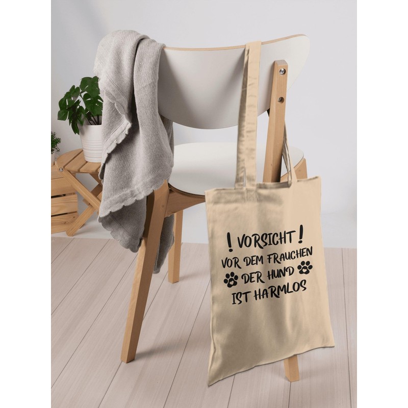 The funny motif "Vorsicht vor dem Frauchen der Hund ist harmlos - Pfoten - Schwarz" will certainly make all dog owners and dog fans shine.