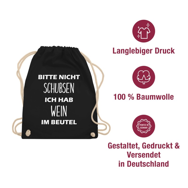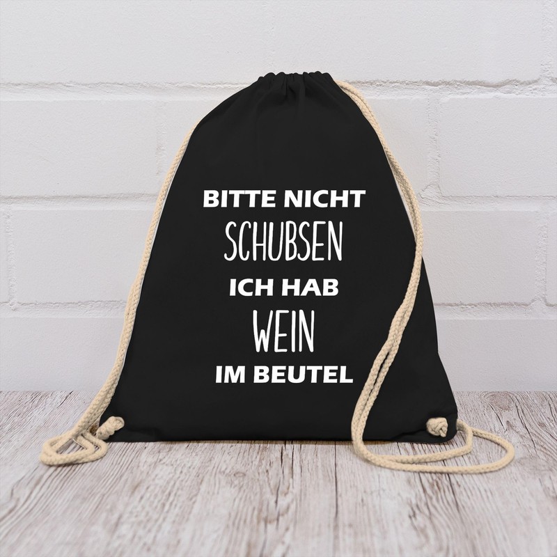 - Festival guests and hipsters looking for "nicht schubsen ich hab wein im beutel" will be happy with the funny motif. German language.