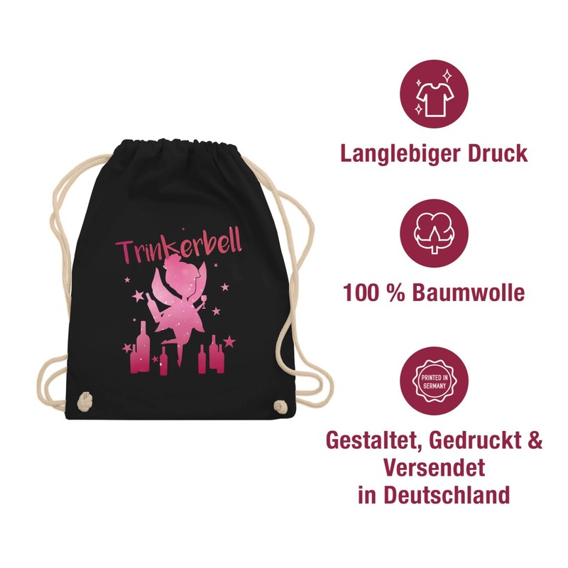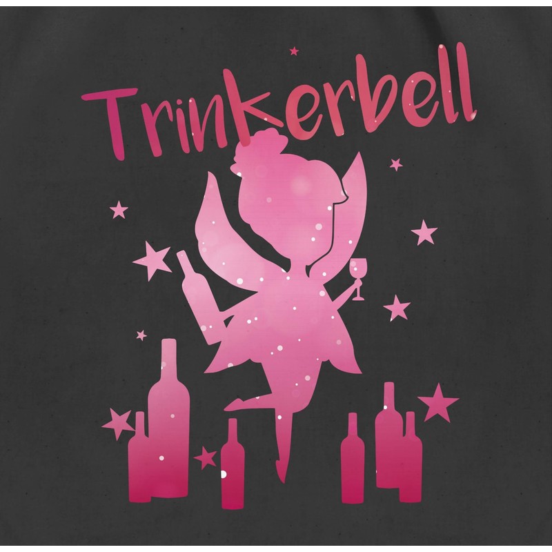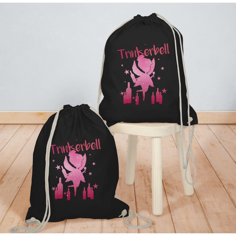 - The perfect design for hen nights: JGA participants and girlfriends of the hen party have been happy for women with this funny motif for a long time. The fun design "Trinkerbell" is perfect for all party queens, festival guests and women and you are guaranteed to hit the mark if you were looking for "gym bag black". What are you waiting for? Grab directly!