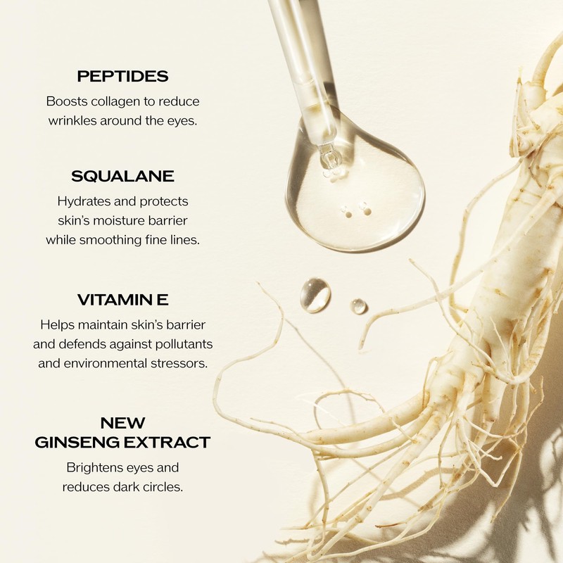 - KEY INGREDIENTS - Squalane hydrates & helps protect skin's moisture barrier. Peptides boost collagen to reduce wrinkles around the eyes. Ginseng Extract reduces dark circles. Vitamin E helps defend against pollutants & environmental stressors.