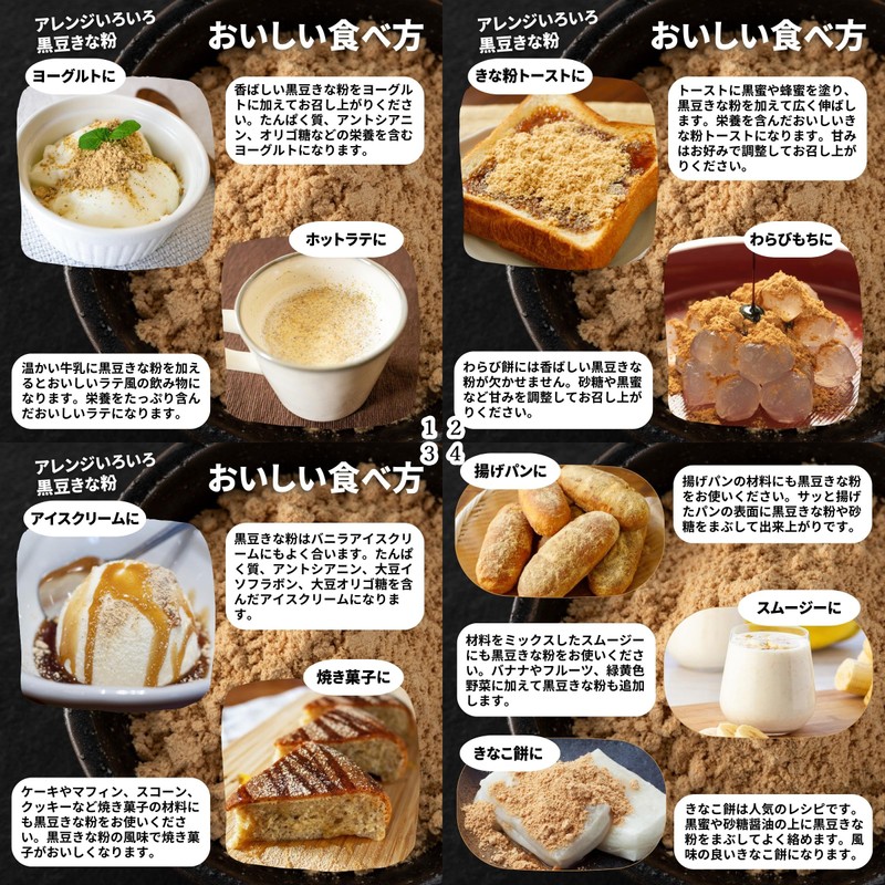 - (About Black Bean Kinako) Kinako is a powder that is fried with black soybeans. Contains dietary fiber, zinc, soy isoflavone, and anthocyanine It is widely used as a confectionery and bread ingredient, and is commonly used for Japanese sweets and Western sweets such as powdered mochi, kinako mochi, and straw mochi