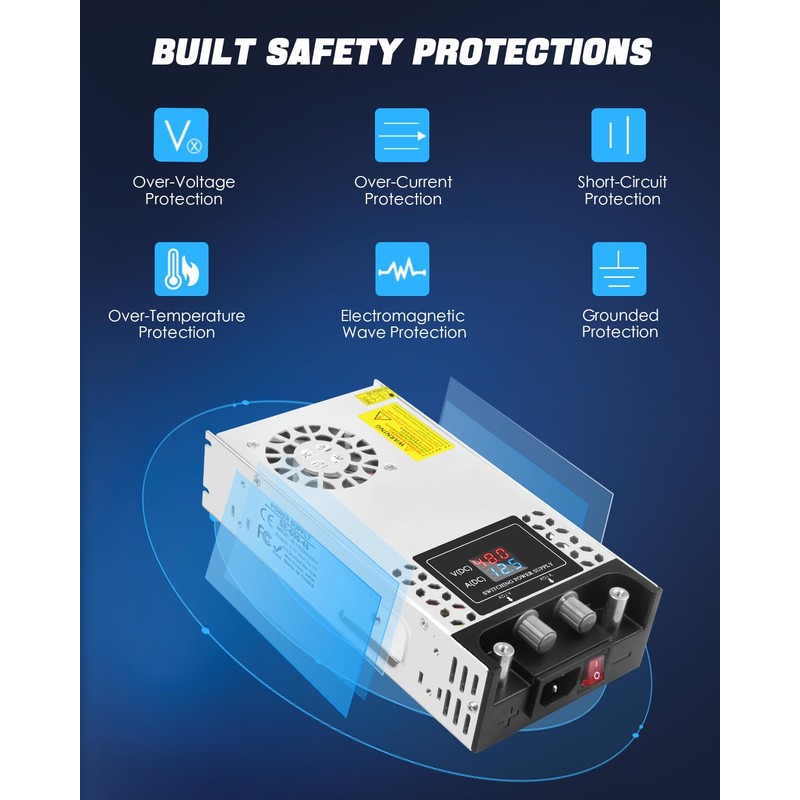 • 【Adjustable Voltage And Current】Input voltage: AC 115V / 230V; Output voltage: DC 0~55V adjustable; Output current: 0~12.5A adjustable,max 12.5A 600W. It's suitable for almost all 0~55V devices; Equipped with LED Screen,it can monitor the output voltage and current in real-time.